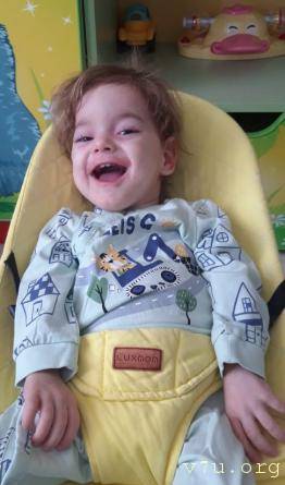 Характер: Вове особенно близка музыка — она вызывает у него восторг! Парень смеётся и хлопает в ладоши, когда слышит знакомые мелодии. Мальчик очень чуток, узнает близких людей по голосу и всегда отвечает улыбкой в ответ на обращенную к нему речь. Он играет наощупь, особенно любит те игрушки, которые издают звуки, например, погремушки. Вова — спокойный ребёнок, растрачивать энергию на лишние движения и эмоции не про него. Иногда он тревожится, но беспокойство быстро сменяется противоположным настроением. Вова сам садится и встаёт, придерживаясь за опору, может передвигаться ползком на животе или переступать при поддержке за обе руки. Ест протертую пищу из бутылочки, самостоятельно держа её в руках.