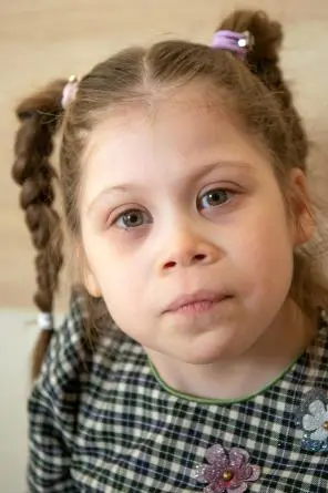 Настя - очень милая, хрупкая, трогательная девочка. Она развивается не как все дети, но очень старается. Настя самостоятельна в быту, умеет сама раздеваться, одеваться, сама умывается, убирает за собой игрушки и помогает другим девочкам в группе. Аккуратно кушает, опрятная, любит красиво одеваться. Настя не говорит, но понимает обращенную речь и простые инструкции. Девочка использует жесты и мимику, чтобы что-то "сказать", - когда ищет поддержки у воспитателя, когда раскаивается в каком-то поступке, когда оценивает поведение других детей, гладя их по голове или грозя им пальчиком. Настя рисует, собирает пазлы, лепит, выполняет аппликации с помощью взрослого, самой ей сложно даются мелкие движения. Играет с куклами, любит игрушки. По характеру Настенька - спокойная девочка, не склонная к резким перепадам настроения.