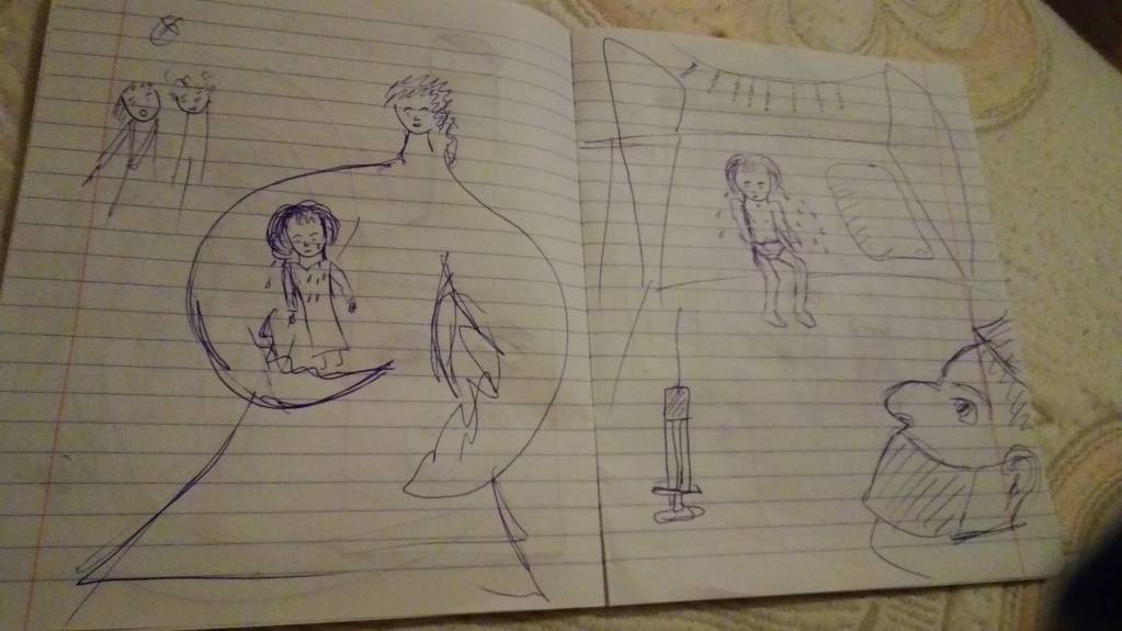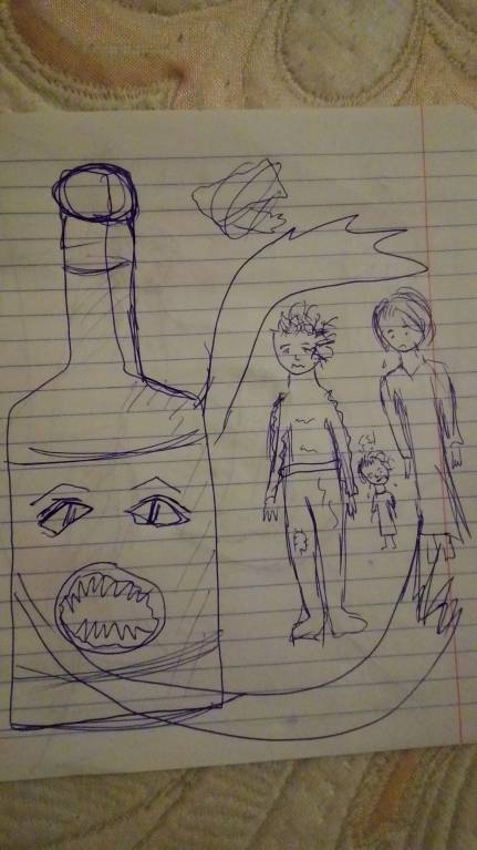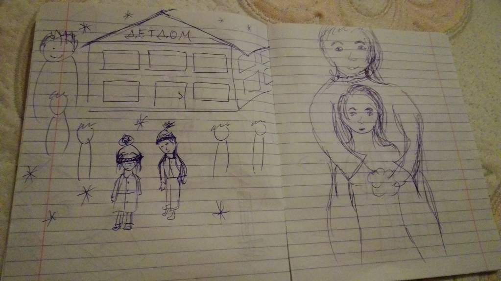 С мамой и папой попрощались (я прям заставила сказать "мама, пока" и "папа, пока"). Потом она рисовала сама. На предпоследнем ее рисунке мама и папа плачут дома вдалеке. А когда на ее рисунке она выросла, то "Мама уже не видна больше нам, а папа умер из-за водки". Проработали немного, что водка - плохо.