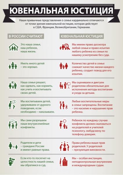 Намерения конечно у ЮЮ благие, никто не спорит, нужная система.Но учитывая НАШУ государственную систему и менталитет будет так:ХОТЕЛИ КАК ЛУЧШЕ, А ПОЛУЧИЛОСЬ КАК ВСЕГДА!Маланья: Еще раз тупо на пальцах объясняю: ювенальная юстиция - это целая система по защите прав несовершеннолетних, которая включает в себя ряд в основном уже существующих организаций и должностных лиц, выполняющих одну главную задачу - СОХРАНИТЬ СЕМЬЮ (пусть даже не совсем благополучную) ДЛЯ РЕБЕНКА И РЕБЕНКА В ЭТОЙ СЕМЬЕ, не дать семье распасться, не подвергать ребенка жестокому обращению, тем паче насилию, не дать ребенку стать наркоманом, преступником