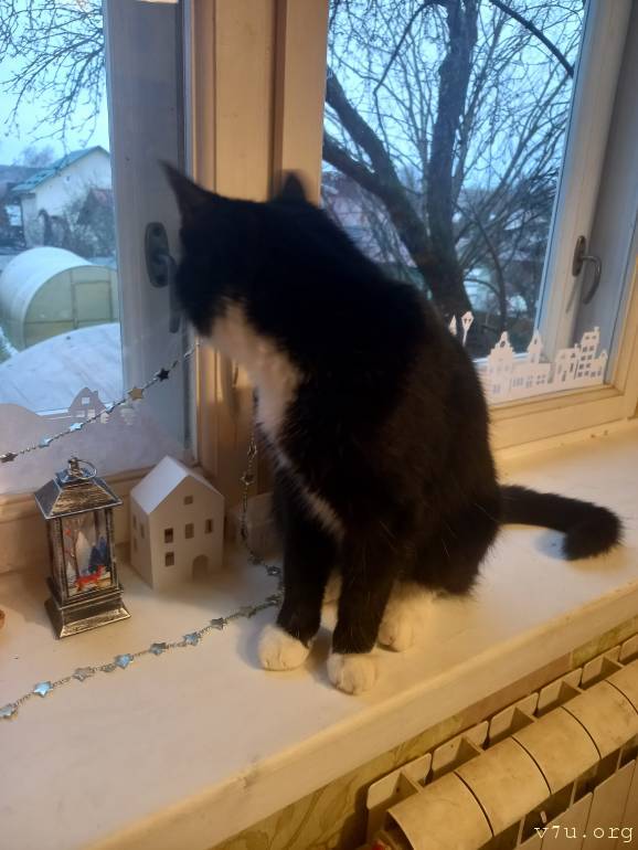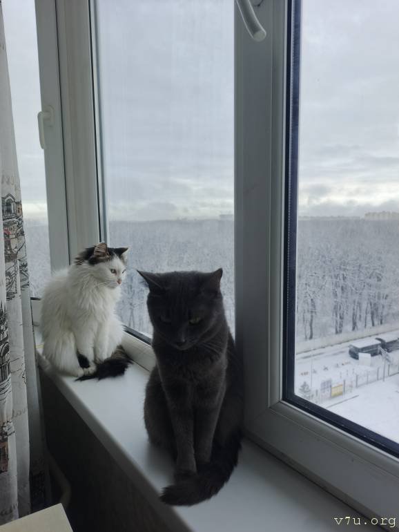А мы любуемся котами. Чем любуются наши коты - непонятно: ни солнца, ни снега, полная серость и мрак. Очень снежок ждём.