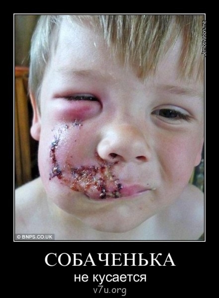Злобыня:Виола,я могла бы выложить кучу фото и видео примеров жестокого обращения двуногих ублюдков с теми же собаченьками.Не буду.Мне это морально тяжело.А на фотке у ребёнка ничего особенного-слегка прихватили.При хорошем укусе нечего было бы зашивать.И кто инициировал конфликт-еще не известно![]()