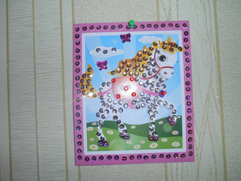 Дочка меня удивила. Нам подарили набор аппликации из пайеток. Возраст на нем 6 лет. Я его ей даже предлагать не стала, думала , рано еще. Вчера вечером попался ей на глаза. Стали пробовать сделать. 1,5 часа сидела и аккуратно, пальчиками приклеивала эти маленькие блестящие кружочки, причем с удовольствием. А я думала что у нас лимит времени на один вид деятельность 10 минут.