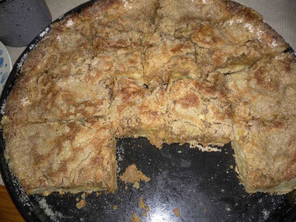 Попробовала этот рецепт использовать в виде начинки поверх дрожжевого теста. Ничего так, чем-то куху напоминает.