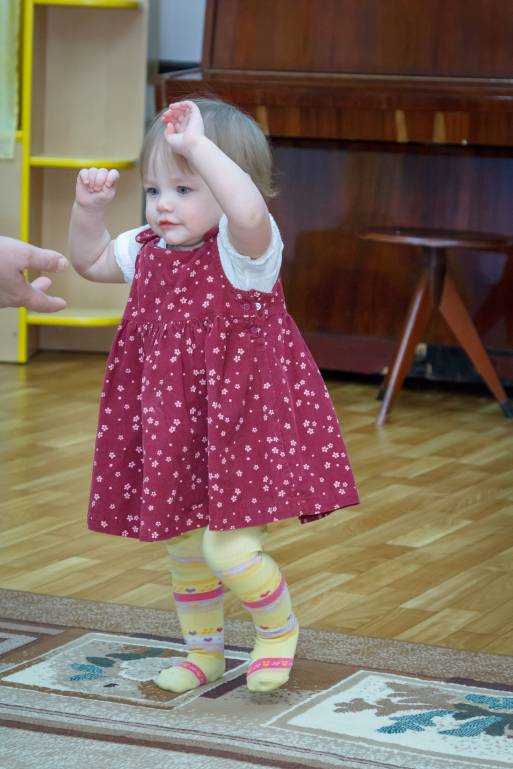 Девочка пока плоховато ходит, до танцевальных па ей еще нужно подрасти, но она любит посещать музыкальные занятия и слушать потешки. Сама Катерина еще не говорит, а обращенную речь, просьбы и инструкции понимает хорошо.