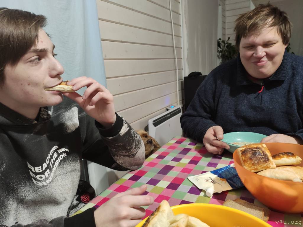 Вот, сегодняшняя фотография. Ужинали. Пыталась сфотографировать Весту (за Сашей) ну и он с мужем в кадре тоже.