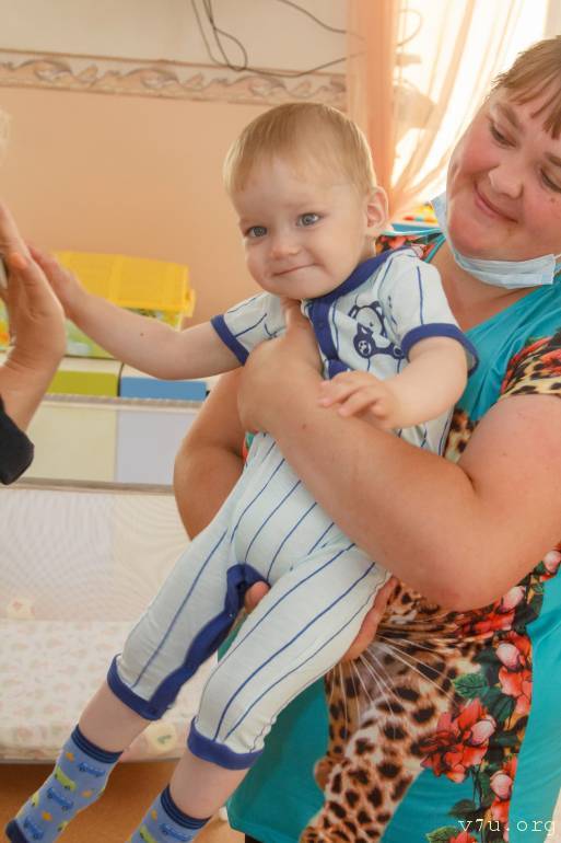 Однако все не так безоблачно. Этому мальчику очень нужно помочь. Его мама, будучи беременной, проходила химиотерапию. Она не хотела отказываться от ребенка. Но в результате Артем родился с проблемами по здоровью. У него плохо действуют левая ручка и левая ножка. И это еще полбеды. Мальчик почти не слышит и плохо видит. Сначала даже возникло предположение, что природа вовсе лишила Артема этих функций. Однако, по словам воспитателей, Артем откликается на общение с ним во время кормления. И я тоже вполне успешно играла с ним в ладшки одной рукой во время нашей фотосессии, когда, увидев, какой серьезный этот мальчик, мы пытались его рассмешить. Тема охотно отозвался и начал улыбаться. Он также явно реагировал на яркую погремушку и на фотовспышку.
