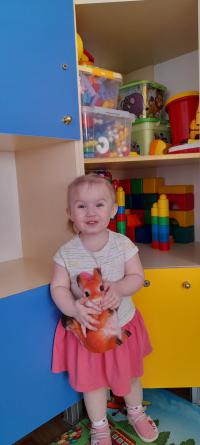 Характер: Активная, любознательная, улыбчивая девочка.Интересуется окружающими предметами, любит яркие игрушки.С удовольствием занимается на музыкальных занятиях.
