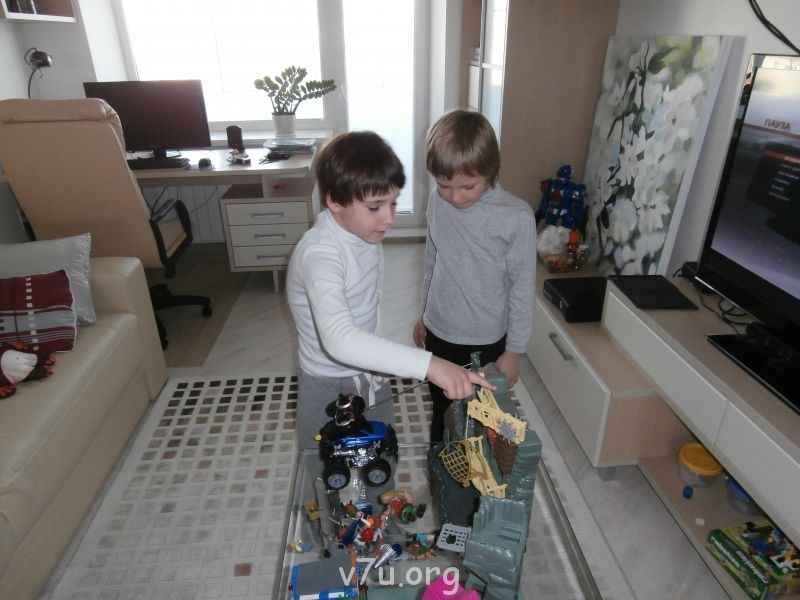 Попросил записать ему в телефон номер Алены, сам ей позвонил, пригласил в гости... Алена прибежала через пять минут. Играли, кушали. Предложил погулять. Отказались оба. У нас эти прогулки... Одному надо "на рыбалку", другой "в лес за грибами", потому идем на рыбалку, но через лес... Некомфортно на улице. (А я хотел на новом "Самурае" покататься, сегодня был халявный тест-драйв, и маршрут прикольный, можно было бы "тапку в пол"... но даже этим их не соблазнишь...) Поначалу играли очень спокойно, потом разбесились, но в пределах... Налаживается у них. Вечером бабушка за принцессой нашей пришла, я на нее всех собак спустил, уши прижала, ушла (медик, блин, не может анализ мочи в лабораторию отнести... слов уже нет... "а она не дается...") Но обои сегодня сухие, никто не жалуется...