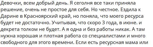 Матери выставили условия по восстановлению на Дарину и малышку: устроиться на работу, закодироваться, привести в порядок жильё. Алименты она платит, детей навещает. Затык в лечении... Срывается.