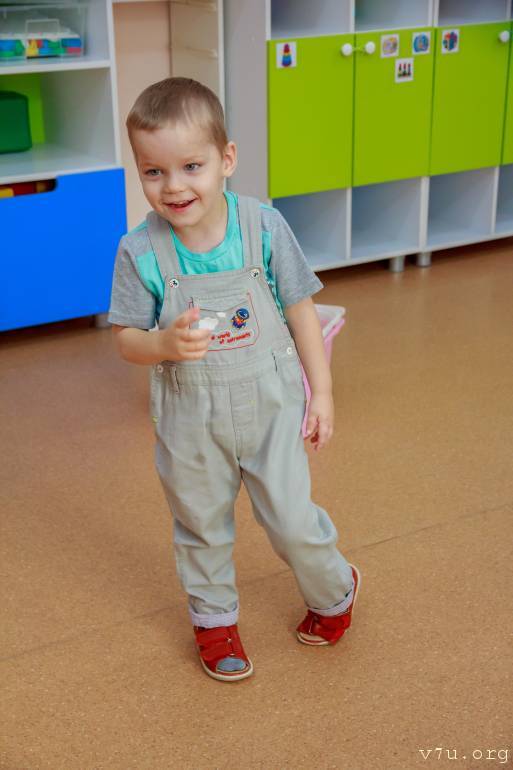 - Пойдем на горшочек, я тебе дам конфетку! – говорит воспитатель мальчику и поясняет, что Артем практически не говорит, но все понимает. - Кушает он самостоятельно, пьет тоже сам, но иногда мы ему помогаем держать кружку.
