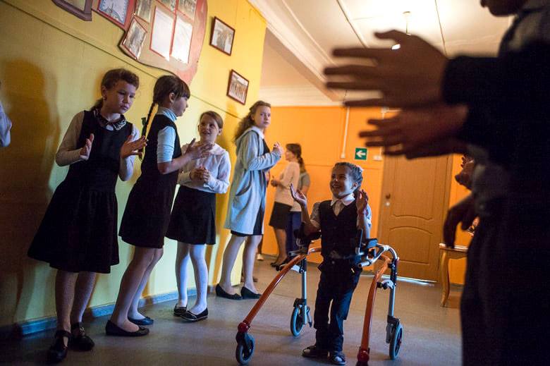 В школе первоклассница вошла в число лучших учеников, хотя, как признается Ирина, особой мотивации у нее пока нет, и хорошие оценки – пока только для мамы. Но само пребывание в школе для ребенка – большой праздник, тем более, бывает там всего два раза в неделю из пяти учебных дней, основное время учится дома, из-за того, что четыре раза в неделю они ездят из Козельска в Калугу на программу по реабилитации. (Боже, дай сил и здоровья ее матери Ирине!). Соня стала центром внимания и любви всей школы, которую Ирина, сама бывший учитель, держала в голове, еще только забирая ребенка из детского дома. Во-первых, школа одноэтажная, где учится всего двести человек. Во-вторых, учебное учреждение со своими добрыми традициями: неслучайно, Софийка звонила в колокольчик на линейке первого сентября, а ее коляску везли десятиклассники. Девочку сразу все увидели, узнали и полюбили. Софийка с удовольствием делает все со всей школой: выходит на зарядку, вместе со всеми поет гимн, на одной перемене выходит на улицу гулять, на другой - в столовую на обед.