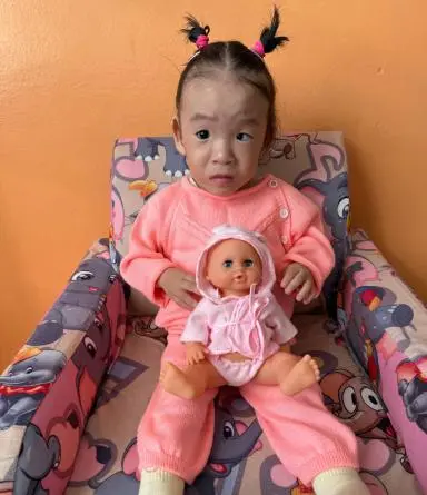 Инга — позитивная, милая и ласковая девочка. Она умеет ходить, интересуется игрушками. В связи с особенностью здоровья девочка получает питание парентерально, для нее требуется особая смесь.