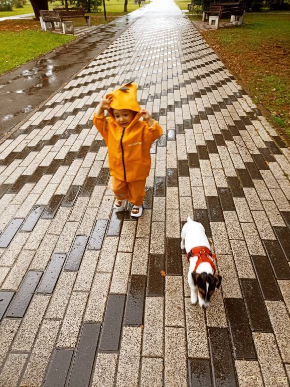 Сегодня дождь лил, как из ведра, но енотики не боятся непогоды, чего нельзя сказать о Кире)