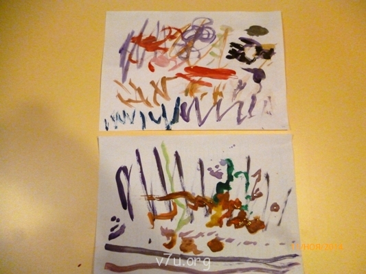 Девочки, с самого начала любовалась шедеврами ваших деток. Сегодня почитала статью выложенную Катеной и решила дать своим порисовать. Напомню, что они 3 недели как дома. Я не знаю чем и как они рисовали в ДР и рисовали ли вообще. Я давала им калякать карандашами и фломастерами, а сегодня решила дать кисточки и гуашь. Вот еще вчера я б их учила рисовать круги-палочки. А сегодня просто дала кисти-краски, самой было интересно, что поучится. Напомню, моим: сыну 3,6 дочери 2,6. Сразу заметила их цветовые предпочтения. Чем бы они не рисовали сын выбирает черный и сиреневый, а дочь красный, черный. Вот выложу наши первые рисунки, может и мне чего скажете.