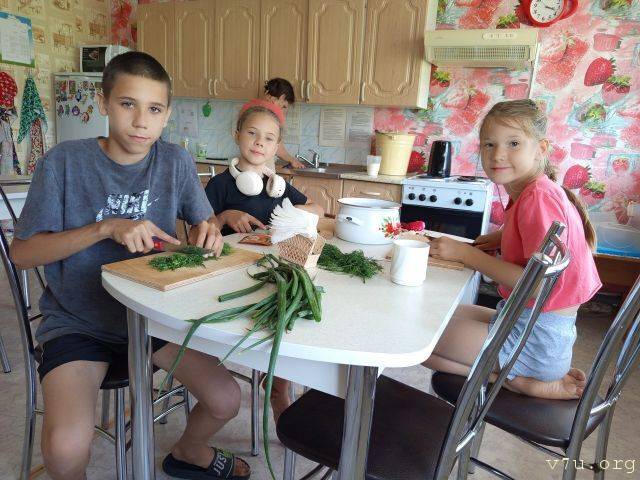 Детский дом приобщает ребят к кулинарии. На одной из фотографий Саша вместе с Семеном и Аней (о них предыдущий пост) режут овощи, выращенные на детдомовском приусадебном участке.