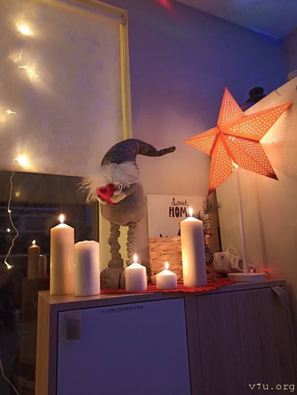 Начала локально украшать домик в труднодоступных местах для создания праздничного настроения)