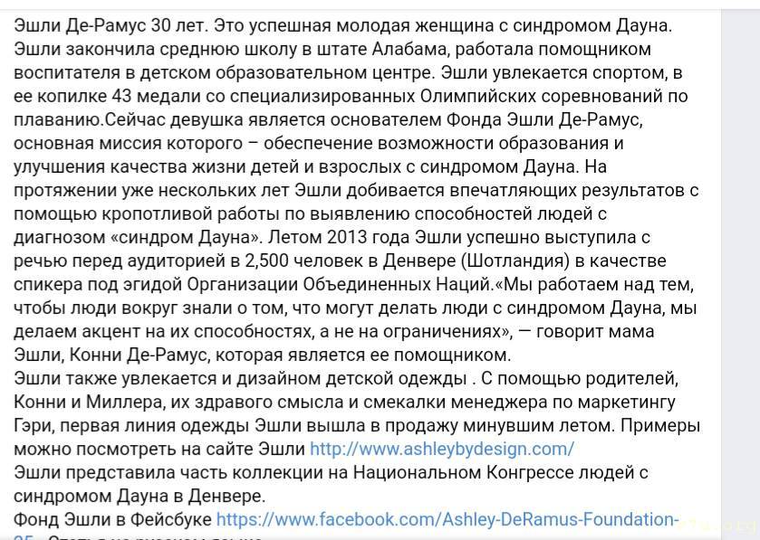 И все же, если вы посмотрите соотношение людей с синдромом , добившихся каких либо успехов , кого больше, у кого простая, а у кого мозаичная форма. В основном мелькают в новостях люди с мозаичной формой. Переодически просматриваю мою любимую Эшли де Рамус у нее синдром с мозаичной формой, она дизайнер одежды и занимается фондом, выявляющие способности людей с синдромом Дауна. Если знаете английский, то можно ей самой и написать, в Америке больше занимаются этим, а она непосредственно человек имеющий такое заболевание и помогающая таким людям. https://m.facebook.com/AshleybyDesignFashions/ http://ashleybydesign.com/Ирина72: 06 мар 2021, 07:12 не раз читала, что мозаик не есть более сохраннее интеллект( и расчитывать что мозаик будет лучше развиваться и большего добьется - не стоит((