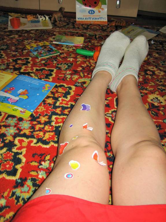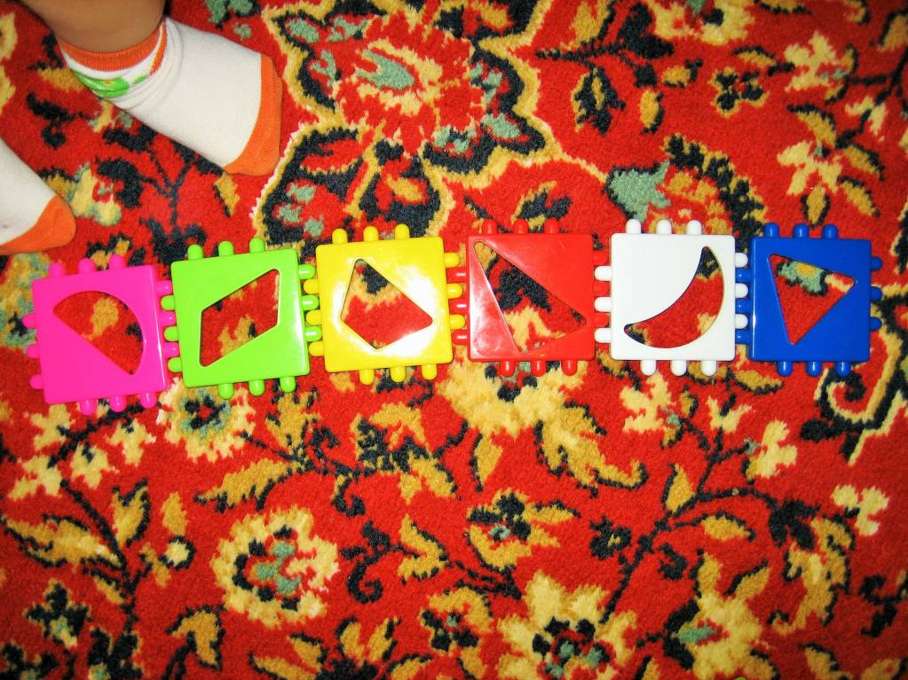 Логические игрушки дочь раскладывает на плоскости интересно, в линию. Маму обклеивает кусочками наклеек из книжек-развивашек (2 книжки уже разорвала)