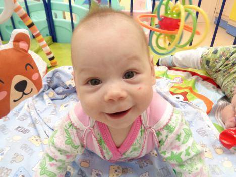 Характер: Девочка спокойная, улыбчивая. Любит тактильный контакт, любит находиться на руках у взрослого. Любит подолгу заниматься с различными игрушками, перекладывает из одной руки в другую.Настроение в течение дня без резких перепадов, ровное. Развивается в соответствии с возрастом.