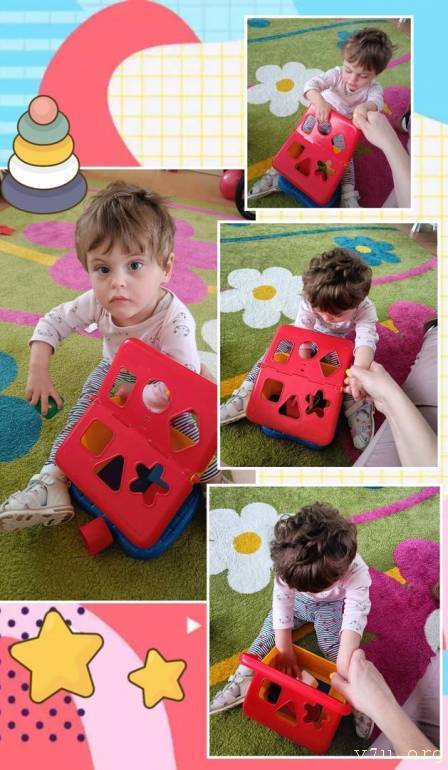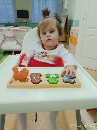 Девочка слабо видящая. Девочка малоподвижная, малоактивная. Эмоциональные реакции в общении со взрослым сдержанные. Проявляет интерес к игрушкам, предлагаемым взрослым (ощупывает, сжимает, перекладывает). Продолжительно и певуче гулит. Любит сидеть на руках у взрослого. Прислушивается к музыкальным игрушкам. Ест с ложки полугустую пищу, пьет из чашки, которую удерживает взрослый, во время засыпания укладывает себя певичем гулением.