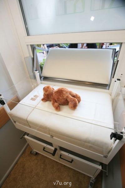 Baby Box - место для спасения жизни ребенка оснащено специальной ударопрочной дверцей, открыв которую, ребенка можно положить в детскую кроватку с высокими бортиками из оргстекла. Как только малыш положен в кроватку и дверца Baby Box за ним закрывается, на посту дежурной медсестры в отделении раздается аудио- (звуковой) и визуальный (красная «тревожная» лампа) сигнал. Если дверца неплотно закрыта снаружи, гидравлическая система закрывает ее до конца автоматически.