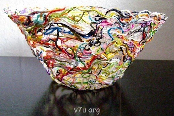 Берете посуду, какая форма нравится, оборачиваете пакетом целлофановым, по-крепче. Мажете клеем ПВА, широкой кисточкой. Потом нитки раскладываете, как придется,еще разочек мажете клеем. Ставим сушить. Как просохнет, снимаем аккуратно целлофан. Все.Катена:На что нитки клеили?