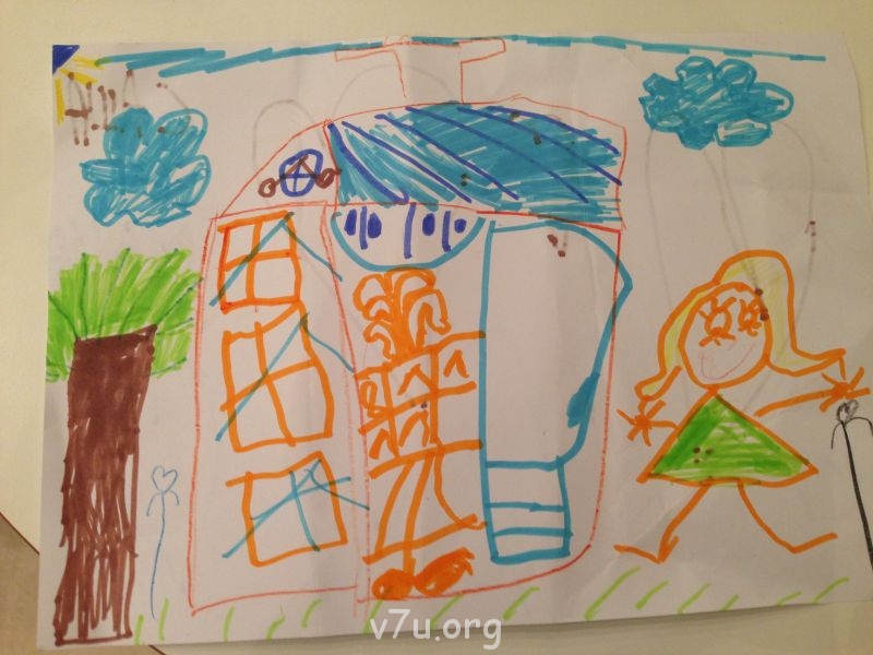 Вчера нарисовала дом, окна, голубые галочки - занавески, дверь открыта, а в доме красивые узоры и козырек.Мы с папой дома, а она гуляет. Гулять у нее - это главное. Дерево "желаний?". Солнце синеее с желтыми лучами. Раньше нас всегда рисовала вместе.