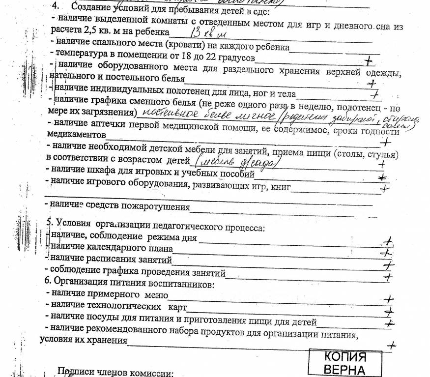 А как стряпается - свежий пример: в одной из школ Москвы новая директор решила избавиться от 19 семейных детских садов, которые были открыты при старом директоре. Для этой цели был организован НЕОЖИДАННЫЙ ВЫХОД в 10 садов одновременно. Были сняты сотрудники из отдела кадров, бухгалтерии, соцпедагог, методист и т.д. итого 10 человек. В первый день вышли в 5 квартир, где функционируют СДС, по два человека на квартиру. На следующий день те же люди вышли в следующие 5 квартир. Чтоб найти причины для закрытия СДС и увольнения воспитателя, были составлены акты ( в одном экземпляре). Так как воспитатели с детьми были дома и ничего такого прям крамольного проверяющие не увидели, то в актах ставили только плюсики. Ничего не подозревающие воспитатели подписывали акт (там же плюсики одни), а второй экземпляр акта им проверяющие не давали и обещали выдать тогда, когда те придут в школу на собрание.