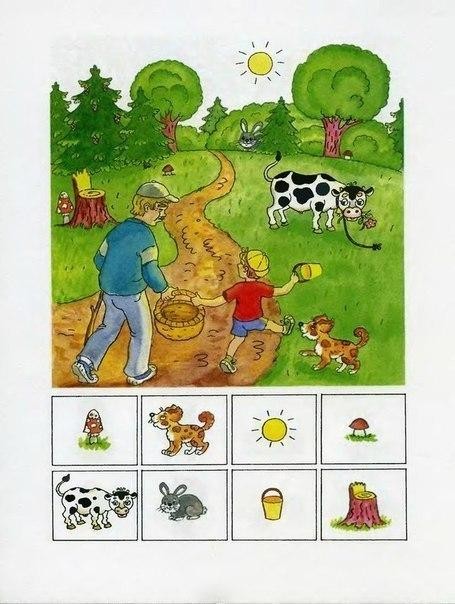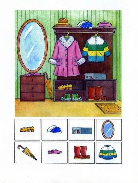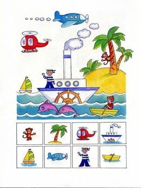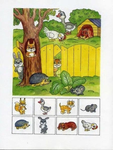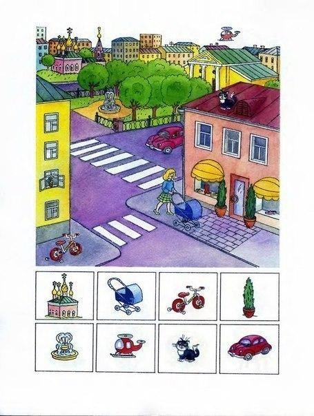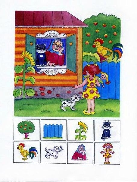 На каждой страничке малыш должен найти и показать на большой картинке предметы, изображенные внизу странички в рамочках. При этом, показывая этот предмет, ребенок должен сказать, где он находится употребляя слова "под", "над", "за", "перед", "в", "на", "между", "около"