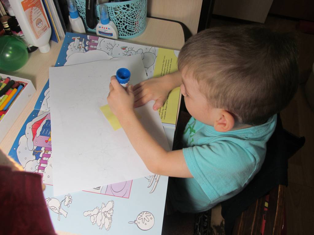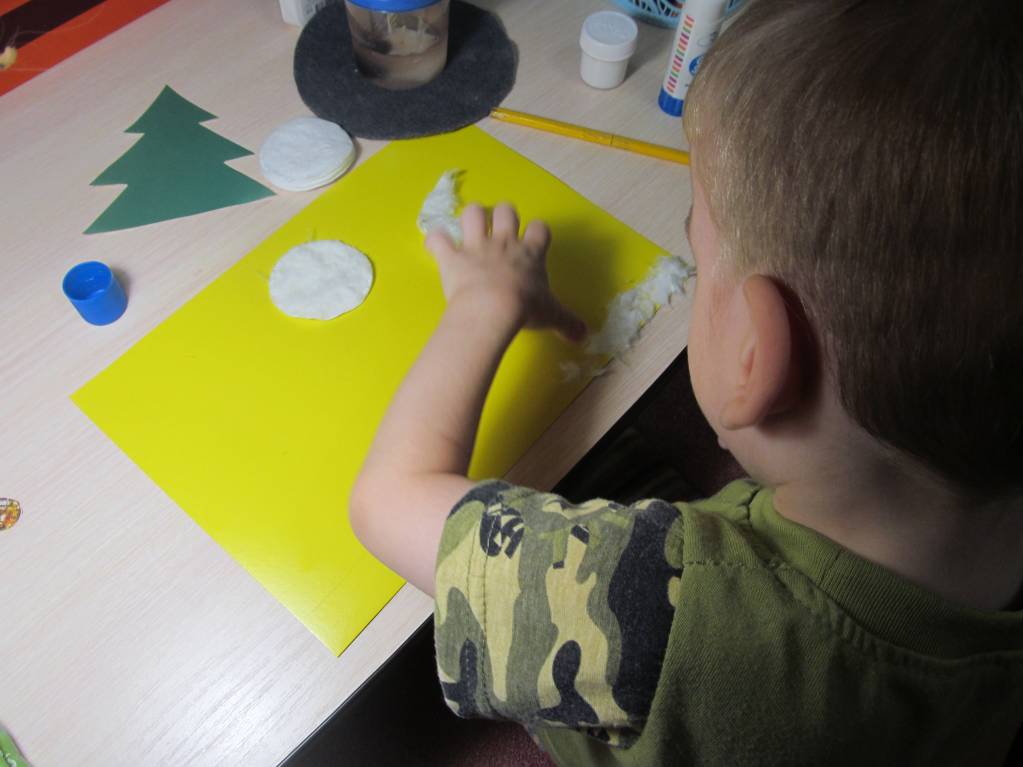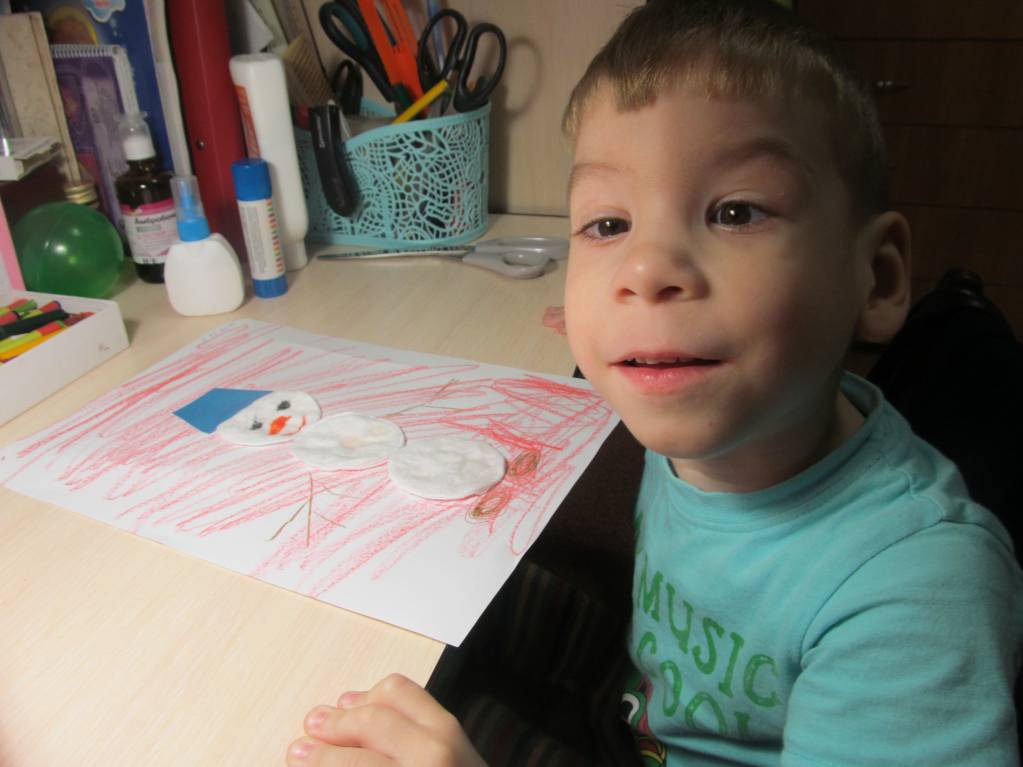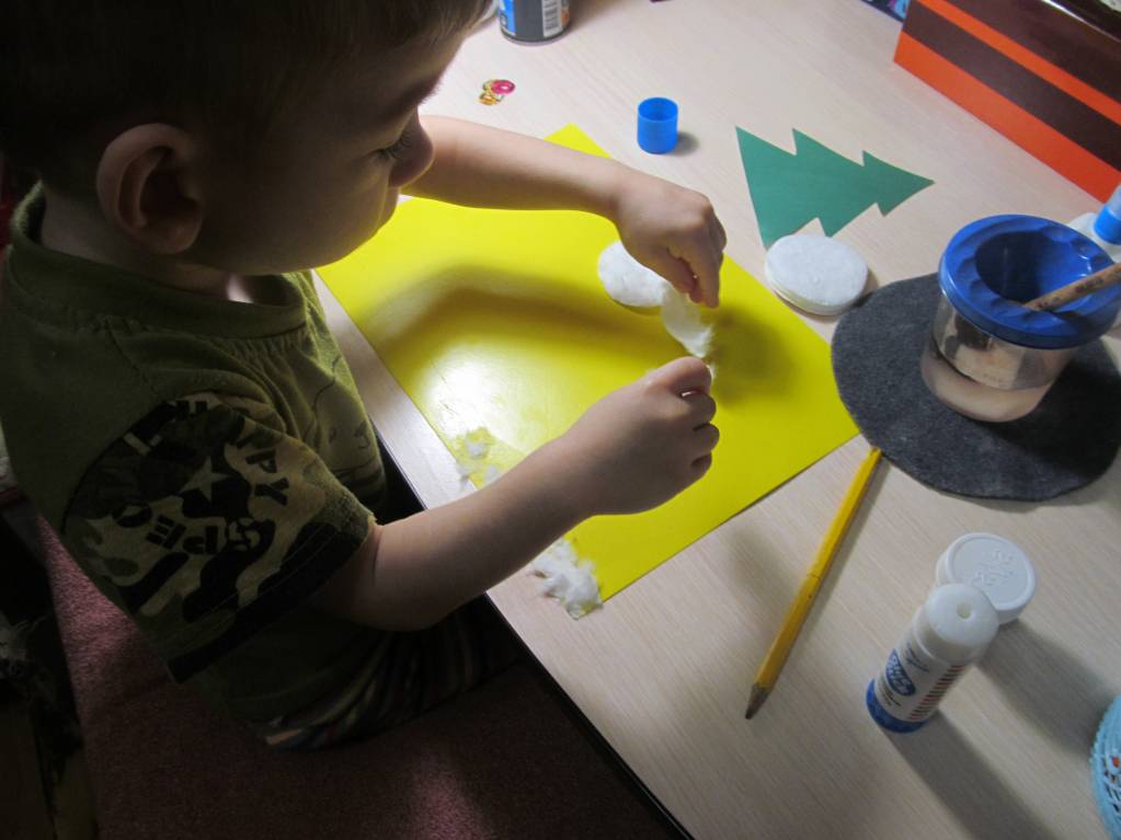 Посадила его за свой столик, дала елочки и кружки, показала на первой ,как наклеивать - остальные сам украшай. И пошла за свой стол вырезать снеговиков. В это время он успел клеем обмазать все пальчики, столик, елочку с обратной стороны (ну, правильно, мы ж до этого все аппликациями увлекались), но только не кружки! Четыре елочки после моих нервных обьяснений о том, ЧТО нужно мазать клеем, ГДЕ и куда приклеивать, он все же украсил) Больше сегодня заниматься не садились. Ходили кататься на тюбинге, нас хватило на 40 минут - дубак заставил идти домой)) Сразу засопливил дома, ну закаляться тоже надо, с другой стороны.