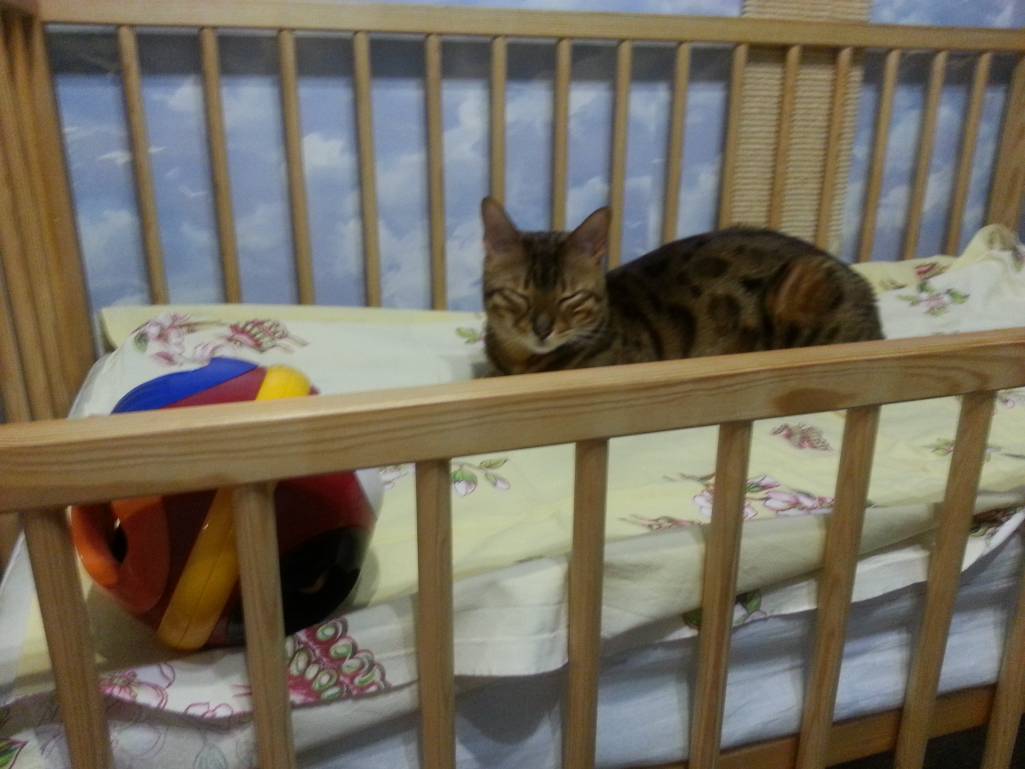olgart, классный котяра, мне они и еще абиссинцы очень нравятся. Наш тоже в кроватке любит спать, иногда и к малышу залезет