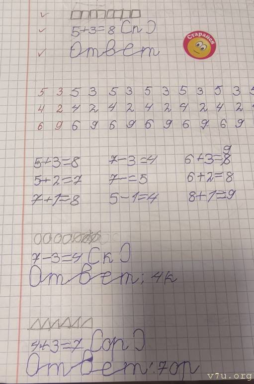 . Рядом мама сидела, я работу ее ребенка тоже видела. Могла с нашей сравнить. Для меня шок был еще какой. Шла домой, слезы накрыли, думала, ну как же ребятенка жизнь помяла, начиная с утробы матери, эх. Зашла по пути в канцелярку, накупила от ранца , канцелярии красивой по полной. Проплакалась по дороге. Домой уже спокойная пришла, внешне. Дочери ничего не сказала. Просто работали. Не скажу, что решала она задачки правильно. А вот оформление стало, и самой мне, да и ей приятно смотреть, и педагогу любому Что уж могли, то смогли.