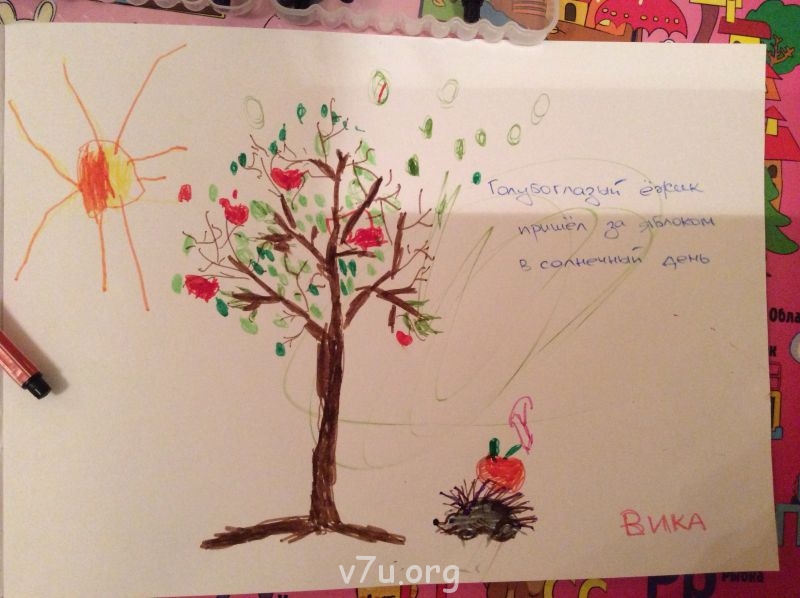 Порисовали. Картину мы назвали "Голубоглазый ёжик пришел за яблоком в солнечный день".