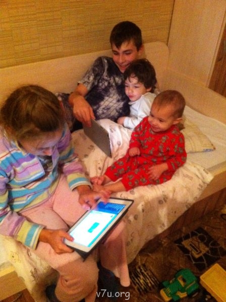 Вот как они спать у нас ложатся - собрались у Ильи на постели, споки ноки посмотрели и спать)))