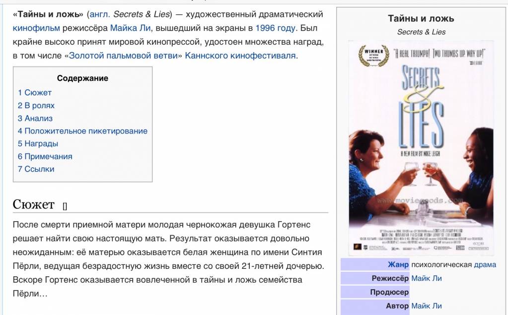 Еще один очень интересный фильм "Тайны и ложь". Выросшая в приемной семье успешная женщина решает найти свою мать. И находит.. Смотрела с удовольствием. Очень интересные персонажи и диалоги.