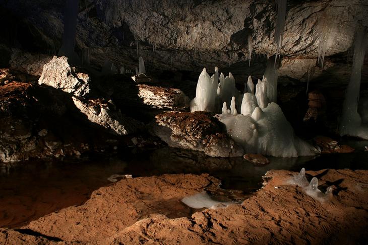 Потом была самая, пожалуй, захватывающая экскурсия - в пещеру Голубинский провал. Вообще, пещеры - это русла древних рек, некоторые из которых сохранились до наших дней, им от 10 до 100 тыс. лет, и всего их в районе Пинежского заповедника около 400. Голубинский провал - самая, пожалуй, доступная для неопытных туристов. Это вертикальная пещера, и, чтобы попасть в нее, приходится спускаться по шаткой деревянной лестнице вниз. Своды ее достаточно низкие, так что я со своим немалым ростом набила достаточно шишек - слава Богу, на голове была каска с фонариком, а то еще одного сотрясения мозга было бы не избежать. Особенно утомили такие своеобразные узкие переходы из одного зала в другой - например, головорез (с острыми скальными выступами по краям, как раз на уровне шей туристов) и проход Винни-пуха, по которому приходится ползти на карачках. Для детей, особо отважных, много ну очень узких лазов, которые очень точно окрестили "шкуродерками". Летом в пещерах темно и грязно, сталактитов, сталагмитов и сталактатов, увы, нет - они тают, и увидеть это красивое зрелище можно только зимой. Температура в пещерах постоянная - около ноля градусов, на стенах видны кристаллы пушистого снега, очень приятного на ощупь. От непривычного физического напряжения мы вернулись на базу все мокрые. Детям после прохождения маршрута вручают почетные дипломы спелеологов. Ребятенок был просто в восторге. Оставшуюся часть отпуска больше ни о чем другом говорить не мог и все время порывался опять слазить в пещеру с другими группами.