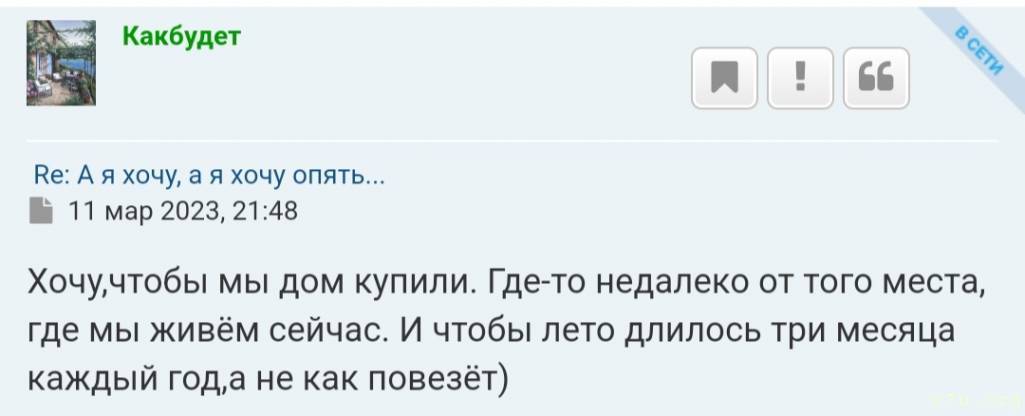 Раз это тема исполнения желаний, то я теперь хочу дом с участком. Там, где мы сейчас живем. А то все прекрасно - климат, погода, море недалеко, но городской дом, без земли. А мы балованы