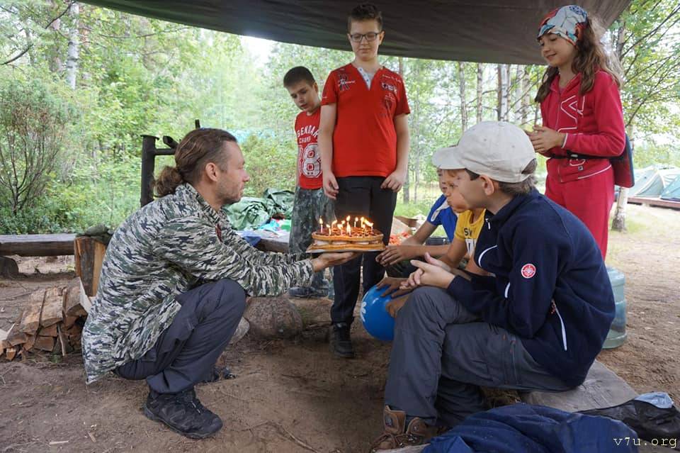 "Маленькие герои" заканчивают программу на базе традиционным блин-шоу - соревнованием по выпечке блинов. А у "отважных искателей" в походе случился день варенья, поэтому имениннику - пирог со свечками... Это специально для тех, кто думает, что дети в походе голодают.