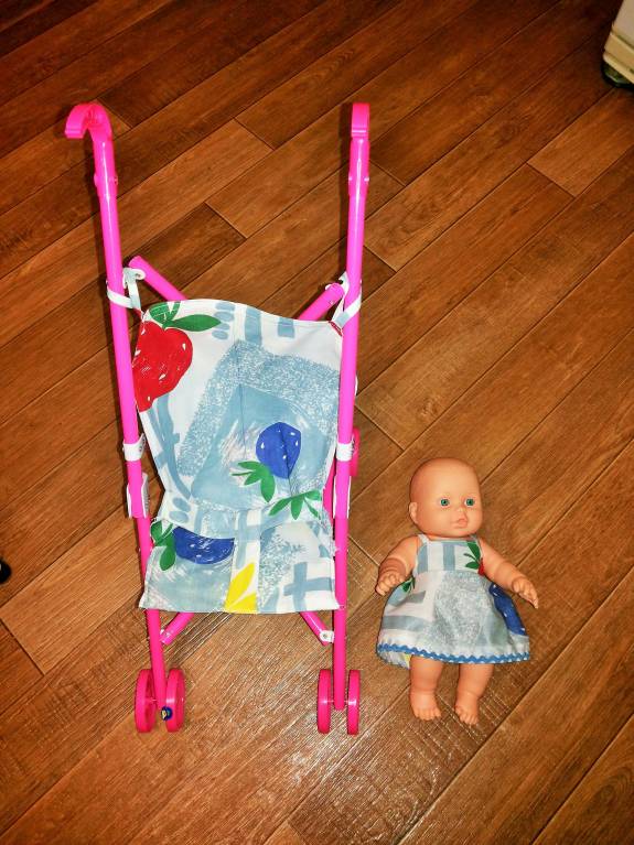 у коляски ,подаренной на НГ дочери, порвалось "посадочное место." Я сшила новое. И захотелось сшить пупсу новый сарафан.