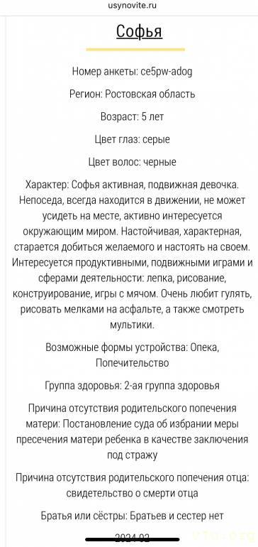 возможно, начат процесс усыновления, он не быстрый. Я по всем, кто меня интересовал, но оказывался "занят", звонила периодически. Даже когда после видеознакомства летела в Читу на личную встречу с ребёнком, узнавала, как можно с пересадками "залететь" на обратном пути в Красноярский край. Вдруг бы в чите не сложилось, а в красноярском селе была девочка 4г, про которую мне 1,5 мес. говорили, что дядя (брат матери вроде) забирает. Я прозванивала её каждую неделю или две, как и остальных из моей "тетрадки". Но когда в очередной раз позвонила перед покупкой билетов в читу, ответили, что её забрал дядя. Из Читы я привезла чудесную дочку. Удачи Вам!Alexandra Tropynina: 01 мар 2024, 00:01 дети в базе висят по 3-4 месяца, а сколько я не звоню по ним, они или заняты или выдано направление или согласие.