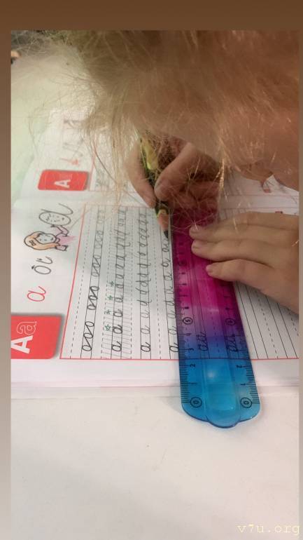 По линейке пишет,я горжусь что она букву А прописную маленькую пишет так хорошо.