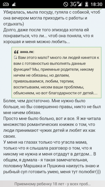 напишу о своем. нынешней зимой приняла в семью 18 летнюю девушку сироту.привела ее буквально с улицы,ей некуда было идти.училище бросила,автоматически лишилась общежития,пристроилась у брата(живет в съемной комнате),но он ее выгнал,мать родная(давно ЛРП) не приняла,так как живет на территории сожителя.последняя надежда была,что примет воспитательница из приюта(девочка полгода до 18 летия жила в приюте,в 17,5 лет ушла из ПС).воспитательница не приняла.больше идти некуда,подружек нет,на улице -20.в общей сложности она прожила у меня 4 месяца.с жильем опека нас технично отшила.я просила предоставить ей койко место в общежитии для выпускников ДД,отказали на том основании,что девочка прописана не в городе,а в селе,нашего же района(она стоит в очереди на жилье,так как ее дом сгорел,но очередь идет медленно,ждать до 10 лет). в опеке предложили ехать в это село и просить в администрации временное жилье.это было бы смешно,если бы не было так грустно.какое жилье в селе?там нет ни гостиниц,ни общежитий.причем ответили в письменном виде,все как полагается.сначала все у нас было шоколадно.я ей свою комнату уступила,сама в зал перебралась.Ленка по дому шуршала,помогала мне по хозяйству и с детьми,по вечерам душевные разговоры вели.она оказывается замуж собиралась."жениха" вживую не видела,но несколько месяцев общалась с ним в контакте.искренне верила,что он не сегодня -завтра за ней приедет и увезет в светлое будущее.тема с замужеством мне показалась странной,я вмешалась,предложила жениху приехать познакомиться с невестой.оказалась машина сломана,на мое предложение выслать денег на дорогу,говорю сама приедет(как раз Новый год на носу)ответил,что денег нет,временные затруднения)написала его сестре,оказалось у него жена и трое детей,один из которых грудной.так что замужество Елене обломилось(а она так надеялась),говорю надейся только на себя.на работу ее устроила,никуда не хотели брать,даже санитаркой в больницу и то по блату.начала работать,тяжело тряпкой махать,быстро надоело.говорю надо учиться.собралась в педучилище.хорошее дело,только надо готовиться,учебники в руки брать,денег на репетиторов у меня нет.вот тут засада,учебники читать неохота.ладно,уговорились,что осенью на повара учиться пойдет,только до осени надо дожить.примерно через 1,5 месяца Лену начала тяготить жизнь в большой семье.она работала 2 через 2.когда с работы приходила-сразу с книжкой на диван(компьютера я ее быстро лишила,проштрафилась сильно,влезла куда не надо,пришлось мне за ее глупости платить).ну отдохнуть после работы -святое дело.но потом 2 выходных,логично как то мне помочь,ведь зашиваюсь,помимо домашнего хозяйства и уроки ,и тренировки.а помогать не хочется.наладилась Елена в поликлинику городскую ездить.то горло болит,то нога,то желудок.уедет с утра,я ей еще денег дам на дорогу,перекусить что то в буфете.приедет к вечеру.где была?у мамы.жить ее мать не пускает,а в гости можно.все это потихоньку нарастало.вроде все просто.ты стала членом большой и дружной семьи.у нас принято помогать друг другу.я и помогала.одели ее с ног до головы(дочка старшая постаралась,передала из Москвы 2 баула вещей),младшая подруг попросила помочь,тоже всего насобирали,даже телефон новый.з/п я ее не трогала,там копейки: меньше 5 тыс выходило.а на дорогу каждый раз давала (у нас в город-из города 100р