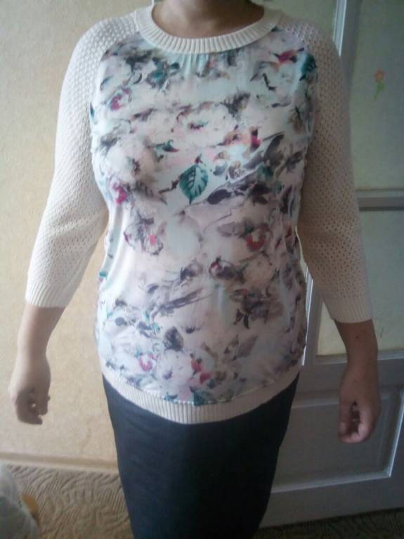 Добавляю фото эту вещь можно реально и на 2 размера меньше, потому что ткань спереди очень растягивается. Низ очень широко, но м.б. конечно, подсядет при стирке еще...Ну и рукава при моих 162 длинноваты, но и подвернуть не получится.