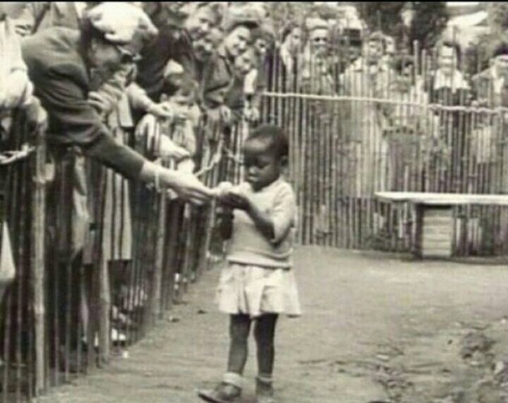 Это девочка в человеческом зоопарке, которой посетительница зоопарка дает банан, как обезьянке какой. И это в Европе 58 года!