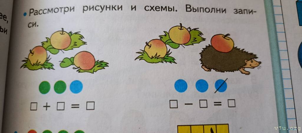 Первую про яблоки: было 2 яблока и плюс еще 3? 4? Стало 3...