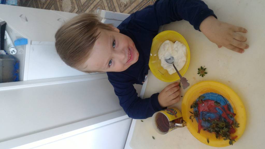 А это бонус. Завтрак поросенка. Клубнику смел, а над кашей час уже чахнет. Хотя был предупрежден, что сначала каша, а потом клубника.
