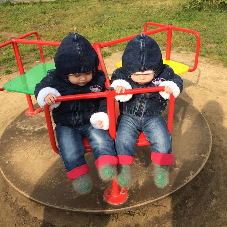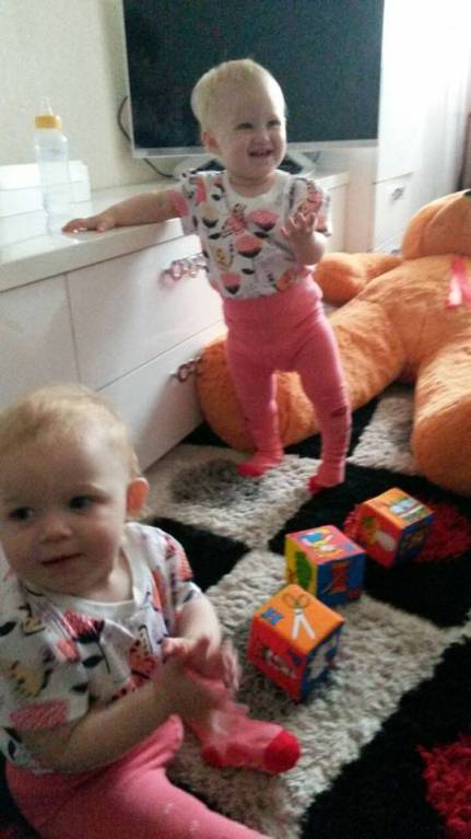 Что за галчата в одинаковых курточках сидят на карусели? Это двойня Маша и Оля! Они, наконец, выпустились из Дома ребенка и теперь живут полноценной домашней жизнью: играют, гуляют, капризничают и отбирают друг у друга игрушки. Лидером в этой сладкой парочке в розовых кроватках является Ольга. У нее и характер потверже, и физических сил больше. Оля уже уверенно и гордо ходит. А Машенька и одежду носит на размер поменьше, и ходьба у нее пока еще с поддержкой взрослого. Однако когда их общей целью становится кухня, где мама Надежда Владимировна готовит что-то вкусное, дети выбирают привычный маневр ползком на четвереньках - гуськом и наперегонки!