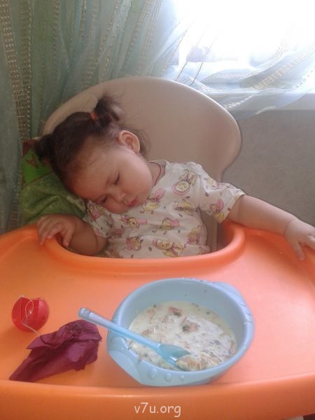 Сегодня у нас был насыщенный день . ну всмысле для Вареника. Утром по магазинам. Вернулись-ей ещё было мало. Покатала ещё на качелях. В песочке поковырялась.В дом заносила с рёвом.до последнего не сдавалась.только я ее раздела,умыла. Кушать посадила. Отвернулась на 5 сек. А она уже готовая..