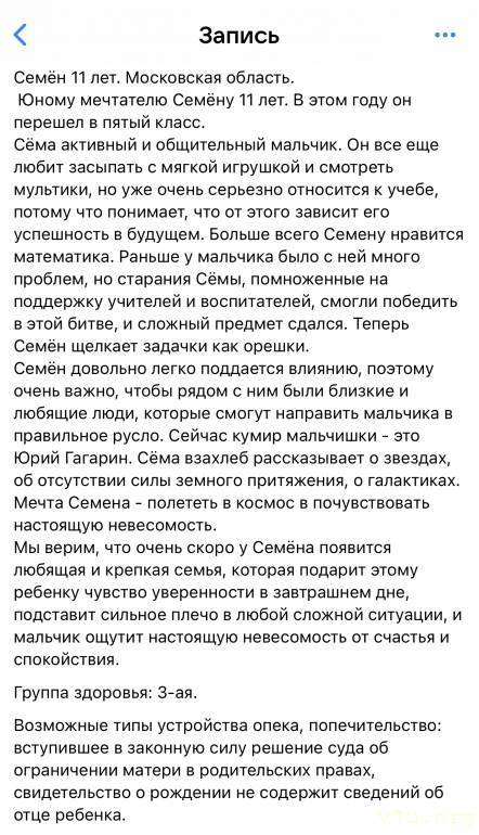 Могу порекомендовать двух братьев в Белгородской области. 12 и 7.5. Мне не подошли, т. к. очень спортивный и сильно на это заточен. Ему нужен кто-то помоложе меня, да и ему не интересна всякая история, литература и пр. Месси - вот для него авторитет. Младший пока сильно смотрит на старшего. Старший парень хороший, думаю. Они ещё в СРЦ, в ДД не попадали. Мать лишёна по алкашке, отца нет.